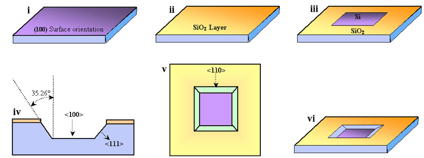 例如對<100>晶面的腐蝕率要比<111>晶面大幾百倍。利用這個特點可以在常用的<100>硅晶圓很方便的刻蝕的通孔,但是孔形是倒金字塔形狀的(或者說是沙漏形的)。隨著摩爾定律的不斷發展,單位面積上晶體管越來越密集,這種占用大量表面積的垂直互連顯然失去了其存在的意義。
