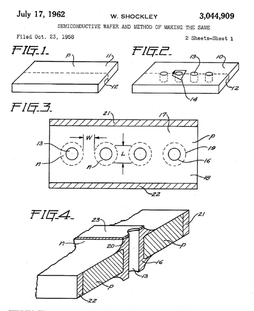 “為什么不能在晶圓上打些孔?” Shockley喃喃自語。不久Shockley申請了一項專利 -(SEMICONDUCTIVE WAFER AND METHOD OF MAKING THE SAME),這是歷史上第一項在晶圓上刻蝕通孔的專利。雖然這項專利的初衷是只為了晶體管在在高頻率領域的應用,但在這項專利中,肖老也提到了如果需要可以在通孔中填充導電金屬。就這樣,發明晶體管的人也成了第一個想到在晶圓做導電孔的人。同一年還發生一件大事,將多個晶體管制造在一起的集成電路(芯片)也被發明出來了。