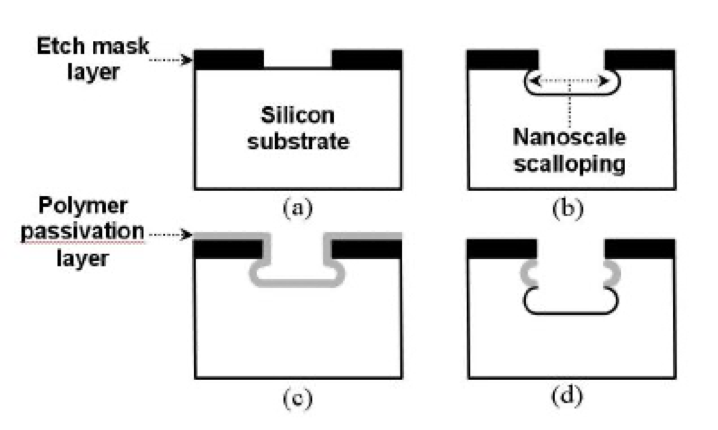 它的具體方法是:先在硅片把需要刻蝕微孔的位置的硅裸露出來,用各向同性的腐蝕氣體在硅片上刻蝕下去一薄層,然后在刻蝕出來的坑的表面沉積保護層,再用等離子打掉坑底的保護層打掉,再用各向同性的腐蝕氣體刻蝕一薄層,通過這樣多次微小的各向同性腐蝕循環就可以在硅片上實現批量的高深寬比微孔的刻蝕。事實上這項技術如此重要,后來也成為MEMS的核心制造技術。