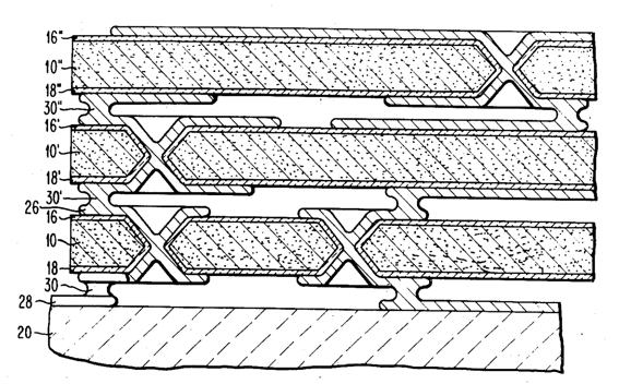 6年之后的1964年,IBM申請了一項專利(METHODS OF MAKING THRU- CONNECTIONS IN SEMICONDUCFOR WAFERS),提出了利用在通孔中做簡并摻雜降低電阻的方式實現硅片的垂直互連,即用低阻硅為導電材料。但是這項專利還只是停留在硅片自身上下表面器件的,并沒有用于多芯片的堆疊。直到5年后的1969年,IBM才在另一項專利 (HOURGLASS-SHAPED CONDUCTIVE CONNECTIONTHROUGH SEMCONDUCTOR STRUCTURES) 中首次提出了基于垂直互連的多層芯片的堆疊,如下圖: