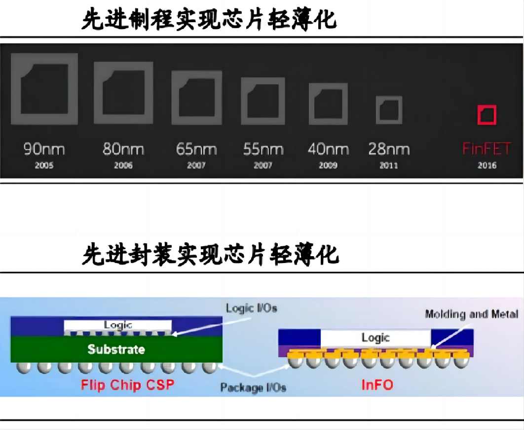 在芯片輕薄化方面,在不犧牲芯片整體性能的前提下,先進制程能夠在算力和晶體管數(shù)目不變時,通過縮小單個晶體管特征尺寸,實現(xiàn)芯片面積(Die size)縮小;而先進封裝,因為封裝對晶體管尺寸無微縮的能力,只能通過更精細(xì)的材料、更致密的結(jié)構(gòu)來實現(xiàn)輕薄化。比如,手機AP處理器的封裝多采用FCCSP的封裝形式,其結(jié)構(gòu)包括一個CSP載板,而Fanout(TSMC與APPLE公司合作,APPLE公司的A系列芯片多采用InFO技術(shù)封裝,即Fannout)封裝,取消了CSP載板(CSP載板約0.3 mm厚度),封裝后的芯片更輕薄,對整機(手機)結(jié)構(gòu)空間余量有重要提升。