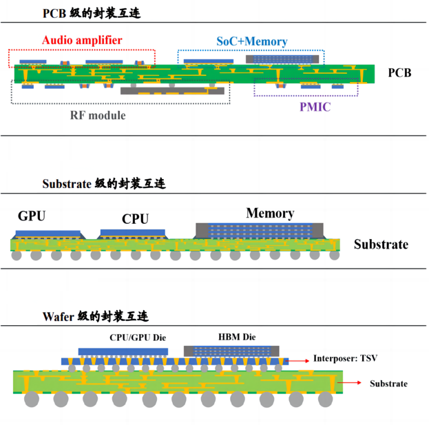 先進封裝是對應(yīng)于先進圓晶制程而衍生出來的概念,一般指將不同系統(tǒng)集成到同一封裝內(nèi)以實現(xiàn)更高效系統(tǒng)效率的封裝技術(shù)。換言之,只要該封裝技術(shù)能夠?qū)崿F(xiàn)芯片整體性能(包括傳輸速度、運算速度等)的提升,就可以視為是先進封裝。傳統(tǒng)的封裝是將各個芯片單獨封裝好,再將這些單獨的封裝芯片裝配到PCB主板上構(gòu)成完整的系統(tǒng),芯片間的信息交換屬于PCB級的互連(interconnect),又稱板級互連;或者將不同的芯片貼裝到同一個封裝基板Substrate上,再完成系統(tǒng)級的封裝,芯片間的通訊屬于Substrate級的互連。這兩種形式的封裝互連技術(shù),芯片間的信息傳輸需要通過PCB或Substrate布線完成。理論上,芯片間的信息傳輸距離越長,信息傳遞越慢,芯片組系統(tǒng)的性能就越低。因此,同一芯片水平下,PCB級互連的整體性能比Substrate級互連的性能弱。在摩爾定律失效之前,芯片系統(tǒng)性能的提升可以完全依賴于芯片本身制程提升(制程提升使得芯片集成晶體管數(shù)量提升)。但隨著摩爾定律失效,芯片制程提升速度大大放緩,芯片系統(tǒng)性能的提升只能通過不斷優(yōu)化各個芯片間的信息傳輸效率,圓晶Wafer級封裝互連技術(shù)的價值凸顯。Wafer級的封裝互連技術(shù),將不同的SoC集成在TSV(硅通孔技術(shù):Through silicon via)內(nèi)插板(interposer)上。Interposer本身材料為硅,與SoC的襯底硅片相同,通過TSV技術(shù)以及再布線(RDL)技術(shù),實現(xiàn)不同SoC之間的信息交換。換言之,SoC之間的信息傳輸是通過Interposer完成。Interposer再布線采用圓晶光刻工藝,比PCB和Substrate布線更密集,線路距離更短,信息交換更快,因此可以實現(xiàn)芯片組整體性能的提升。圖XX示例為CoWoS封裝(Chip on Wafer on Substrate),CPU/GPU die與Memory die通過interposer實現(xiàn)互連,信息直接通過interposer上的RDL布線傳輸,不經(jīng)過Substrate或PCB,信息交換快,系統(tǒng)效率高。從半導(dǎo)體制程進入10nm以來,摩爾定律已經(jīng)失效,即芯片迭代不再滿足“集成電路芯片上所集成的晶體管數(shù)目,每隔18個月就翻一番;微處理器的性能每隔18個月提高一倍,而價格下降一倍”。在后摩爾定律時代,對于“more than moore”的延續(xù),先進封裝是業(yè)界公認(rèn)的有效途徑。